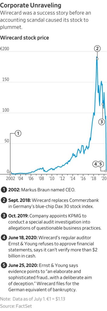 Le titre de l’article de CNBC est accrocheur: The Enron of Germany’: Wirecard scandal casts a shadow on corporate governance . Mais force est de constater que l’implosion de Wirecard, vu comme porte-étendard du potentiel des fintechs, épargne peu d’intervenants. Rappelons que la société fondée à la fin des années 1990 a fait son entrée à la bourse de Francfort en 2005, date charnière puisqu’elle acquiert alors une société qui lui permettra de se développer comme fournisseur de service de paiement. En 2015, le Financial Times (FT) amorce une série d’articles avec un titre évocateur – et prophétique: House ot Wirecard… Les articles vont bien entendu soulever des doutes quant à l’intégrité des états financiers. Ils n’empêcheront pas Wirecard de poursuivre sa croissance par voie d’acquisition pour devenir la plus important fintech d’Europe selon le FT. En 2018 et 2019, divers événements relevés par le FT continuent de soulever des doutes relativement à la situation financière de Wirecard. Puis, en avril 2020, un rapport d’audit extraordinaire remet en cause tout l’édifice en notant l’incapacité de confirmer que l’entente assurant l’essentiel des bénéfices de la société était authentique. Le 18 juin, alors que des enquêtes criminelles sont lancées, Wirecard annonce qu’elle ne peut « retracer » 1,9B d’Euros… Le résultat sur le cours du titre est catastrophique comme en fait foi ce graphique du Wall Street Journal.