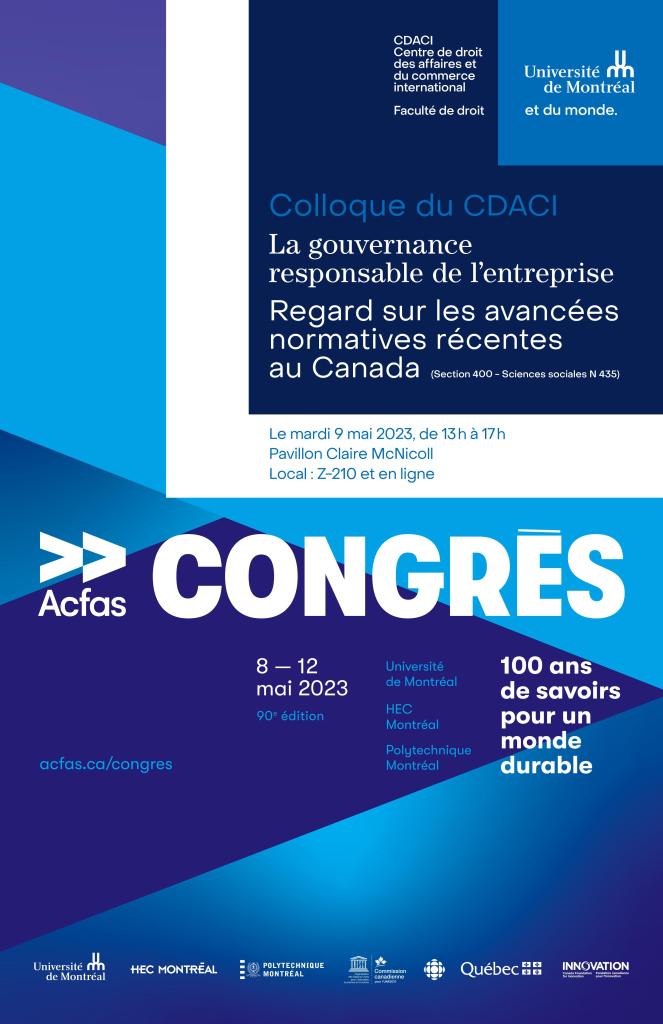 Dans le cadre du 90e Congrès de l’ACFAS, j’ai le plaisir d’organiser avec ma collègue Renée-Claude Drouin un colloque sous l’égide du Centre de droit des affaires et du commerce international (CDACI) ayant pour thème La gouvernance responsable de l’entreprise : regards sur les avancées normatives récentes au Canada.