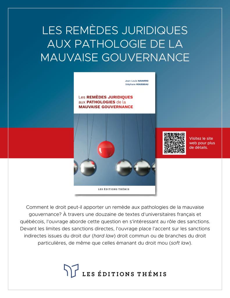 Il me fait plaisir d’annoncer la parution de l’ouvrage collectif Les remèdes juridiques aux pathologies de mauvaise gouvernance co-dirigé avec Jean-Louis Navarro qui est le fruit d’une autre belle collaboration entre le Centre de droit des affaires et du commerce international (CDACI) de l’Université de Montréal et la Faculté de droit Julie-Victoire Daubié de l’Université Lumière Lyon 2.