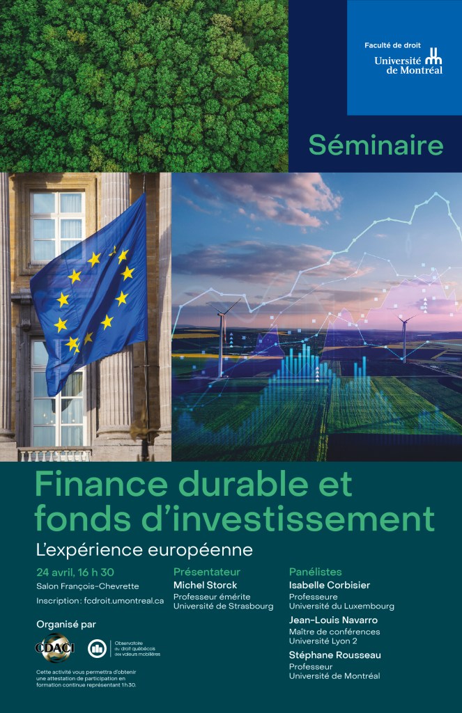 Le 24 avril prochain, l’Observatoire du droit québécois des valeurs mobilières acceuille le Pr Michel Storck de l’Université de Strasbourg à l’occasion d’un séminaire sur la finance durable et les fonds d’investissement. Expert reconnu du droit des organismes de placement collectif, le Pr Storck partagera ses réflexions sur le Règlement européen sur la publication d’informations en matière de durabilité dans le secteur des services financiers (Règlement SFRD). La présentation du Pr Storck sera suivie de commentaires de Jean-Louis Navarro (Université Lumière Lyon 2), Isabelle Corbisier (Université du Luxembourg) et de moi-même.