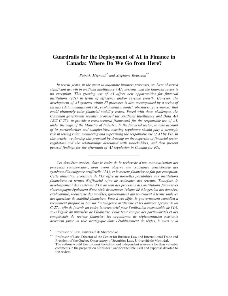 Dans notre article intitulé Guardrails for the Deployment of AI in Finance in Canada: Where Do We Go From Here? publié dans le 6th Annual Fintech Issue (no. 1, vol. 41) du Banking and Finance Law Review, Patrick Mignault et moi explorons cette question dans le contexte du secteur financier.
